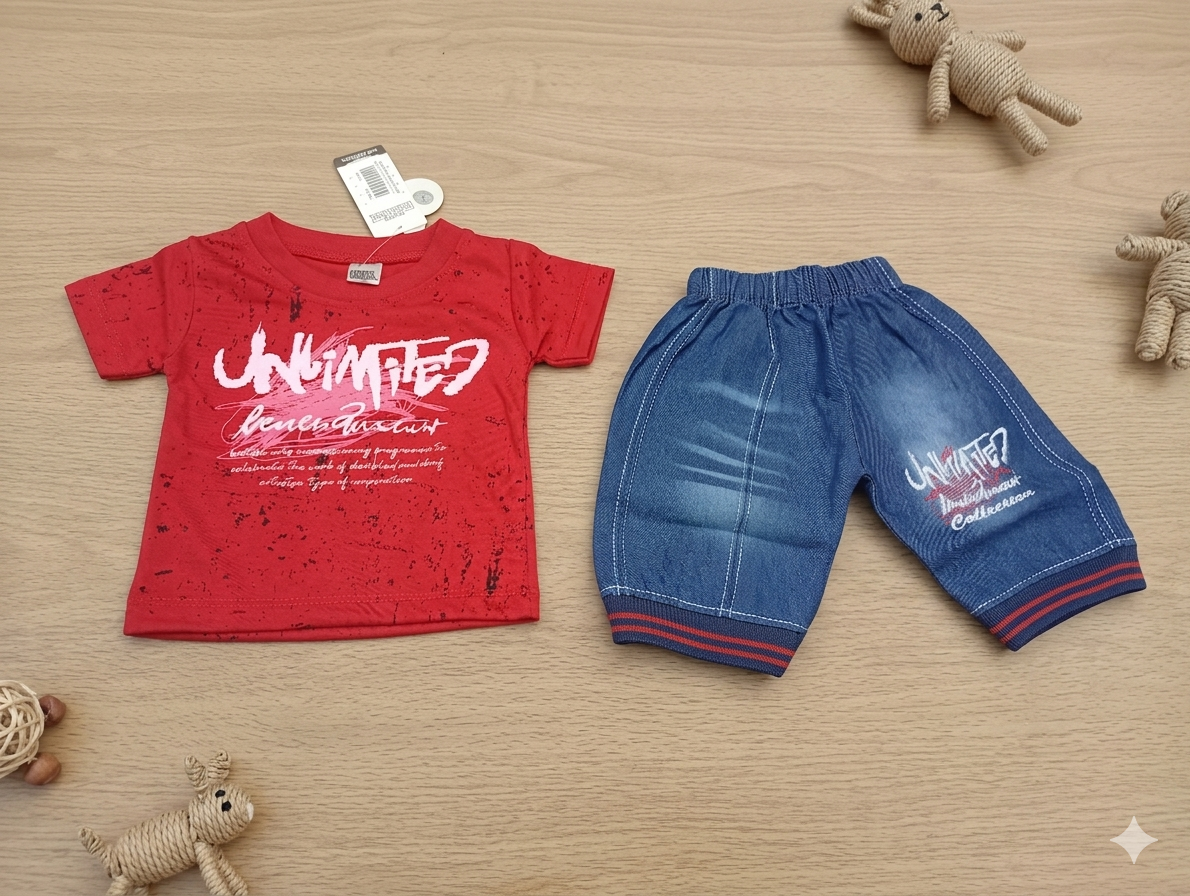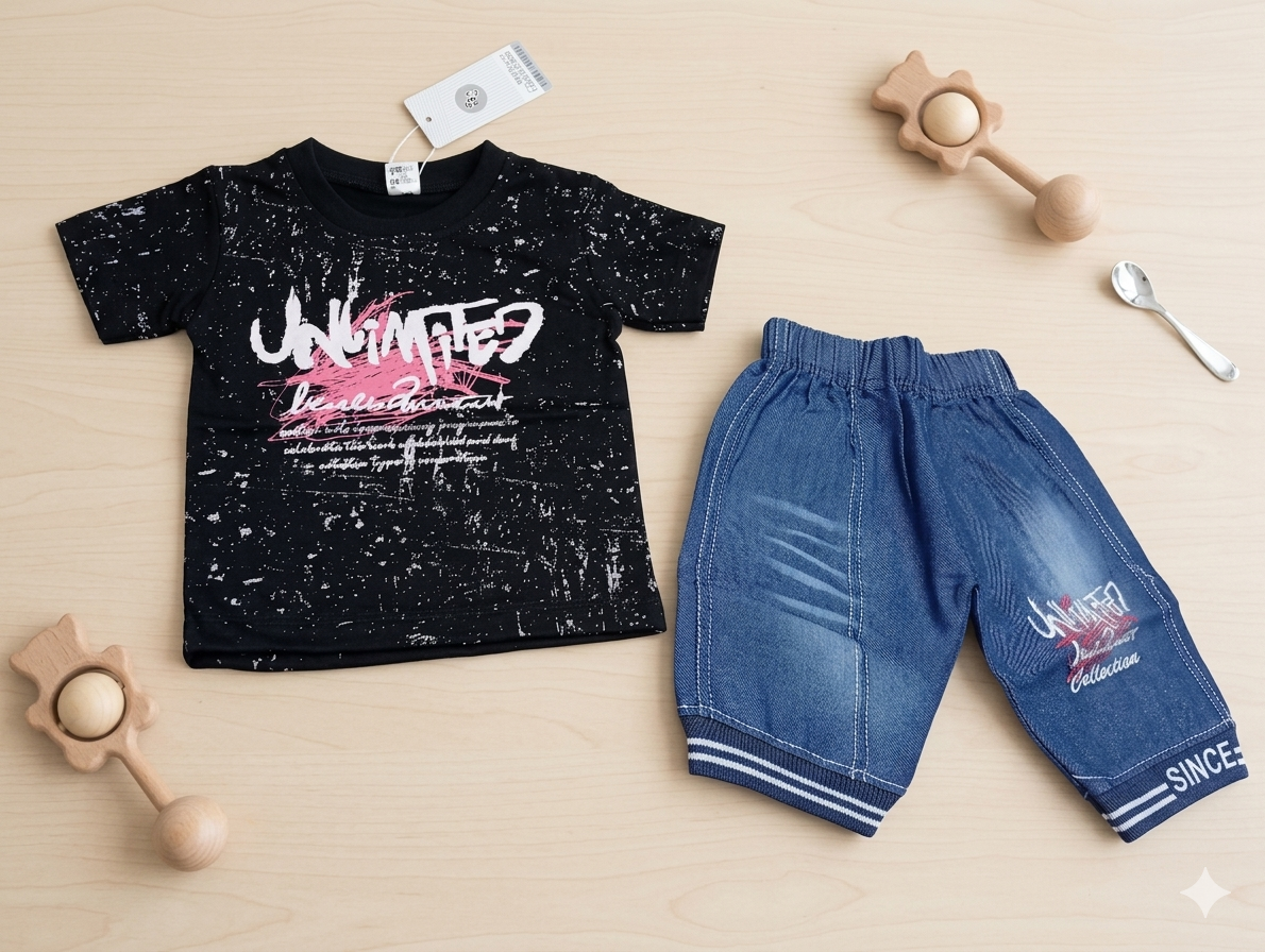 Shorts Details: Deep blue denim-look fabric with an elasticated waistband and coordinated “Unlimited Collection” branding.