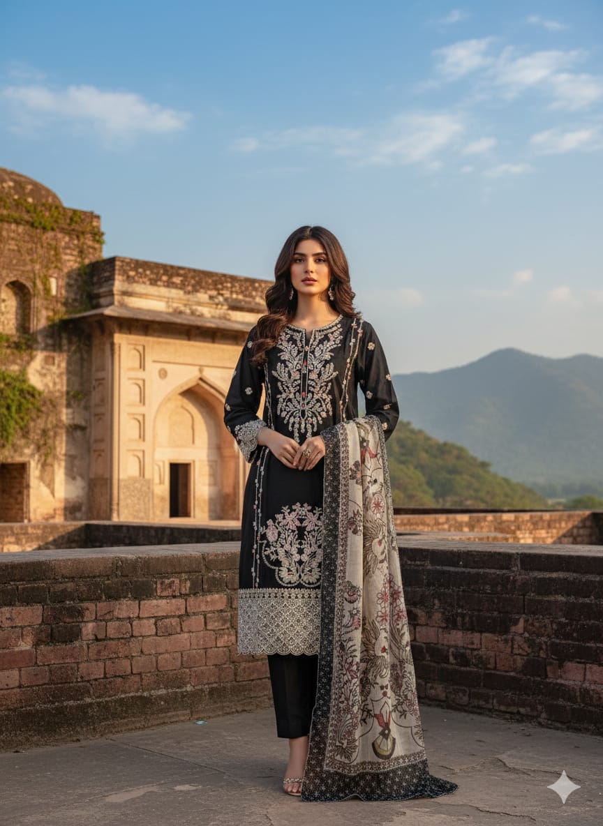 Embroider 3 piece ladies suite with premium quality fabric soft and comfortable.Upgrade your wardrobe with this elegant ladies 3-piece suit, designed for style and comfort. Crafted from premium quality fabric, this set includes a beautifully stitched shirt, matching trousers, and a graceful dupatta that completes the look. Perfect for casual wear, festive occasions, or everyday elegance, its soft texture and breathable material ensure all-day comfort. Available in attractive colours and trendy designs, this suit adds a touch of sophistication to your personality.