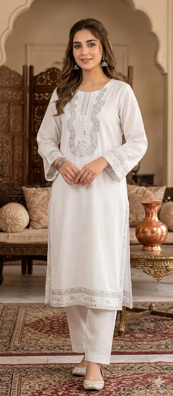 “Elegant ladies’ white suit designed with soft fabric and a timeless look—perfect for a graceful and classy appearance.”