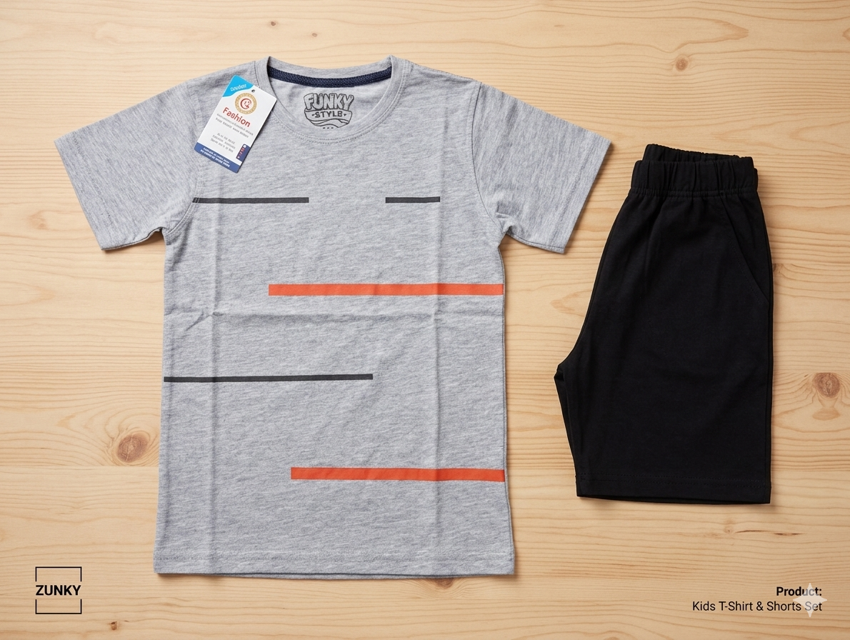 T-Shirt Design: A classic crew neck tee in heather grey, accented with a contemporary minimalist graphic of horizontal charcoal and vibrant orange stripes.